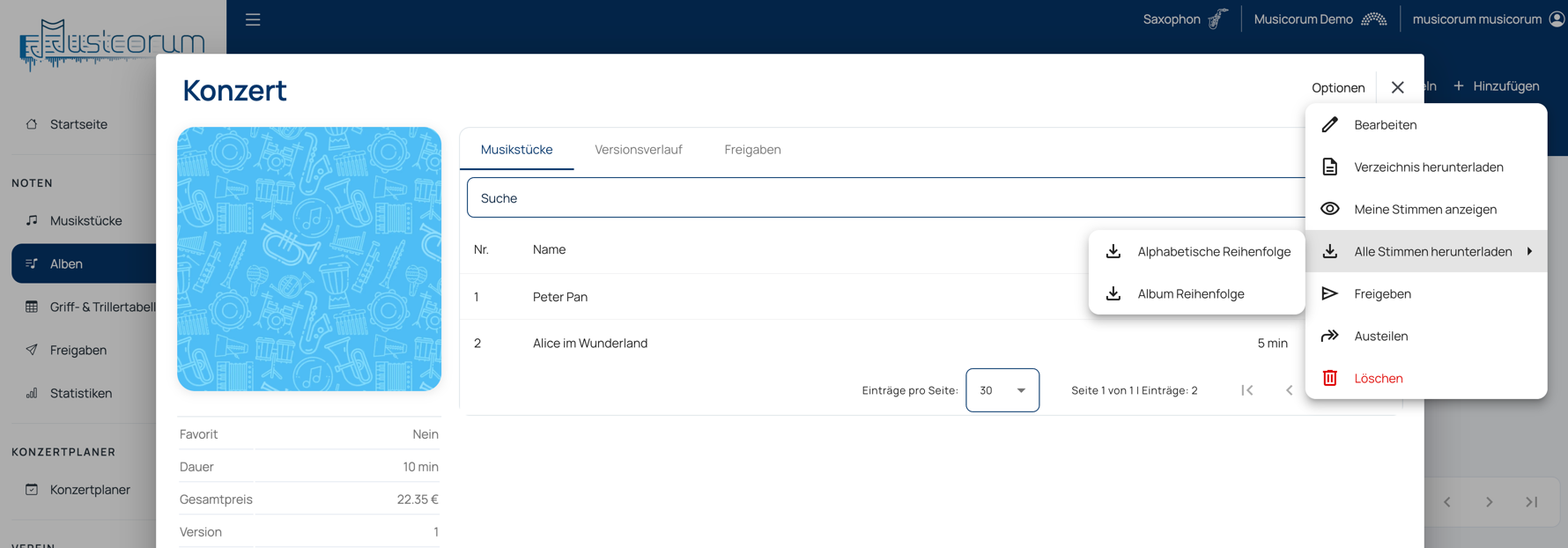 Sie sind als DirigentIn in der Lage, Musikstücke und Alben zu sehen und alle Stimmen herunterzuladen. Im Folgenden werden Ihnen diese Möglichkeiten einmal erklärt.