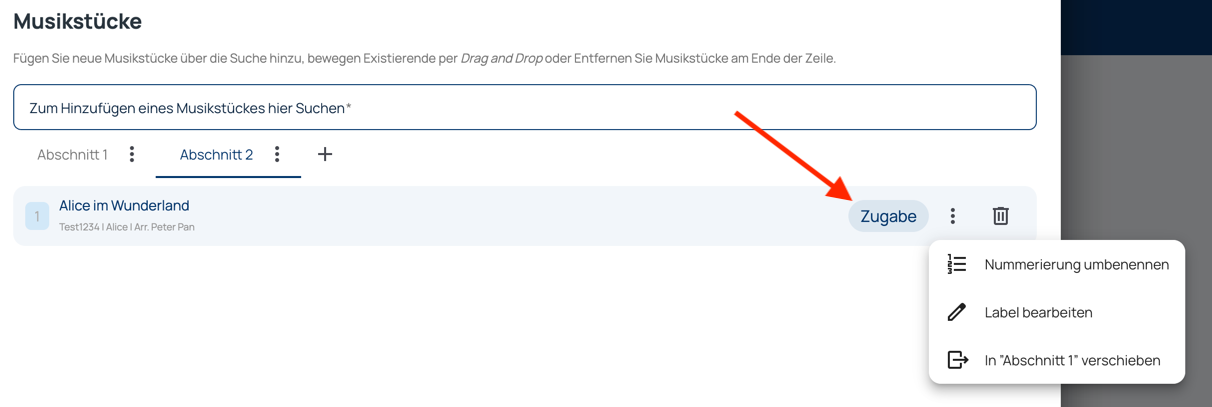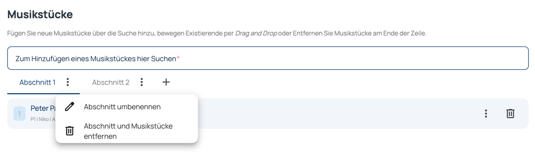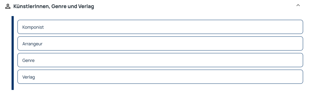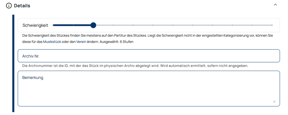 Sie können alle Musikstücke des Vereins durchsuchen und sehen alle Informationen, die mit diesem Musikstück eingegeben wurden.