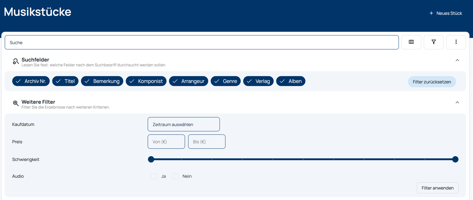 In der oberen Leiste finden Sie ein Suchfeld, in das Sie beliebige Begriffe eingeben können, um passende Musikstücke aus Ihrem Archiv zu finden. Direkt unter dem Suchfeld können Sie festlegen, welche Datenfelder bei der Suche berücksichtigt werden sollen. So können Sie zum Beispiel entscheiden, ob die Suche im Titel, beim Komponisten, Arrangeur, Genre oder anderen Merkmalen durchgeführt wird. Diese Felder aktivieren oder deaktivieren Sie einfach durch Anklicken.
