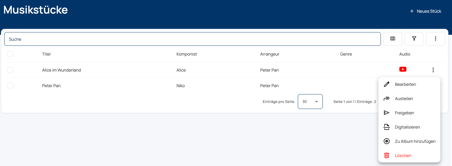 Navigieren Sie über das Hauptmenü auf der linken Seite über Musikstücke zur Ansicht aller Musikstücke des Archivs.